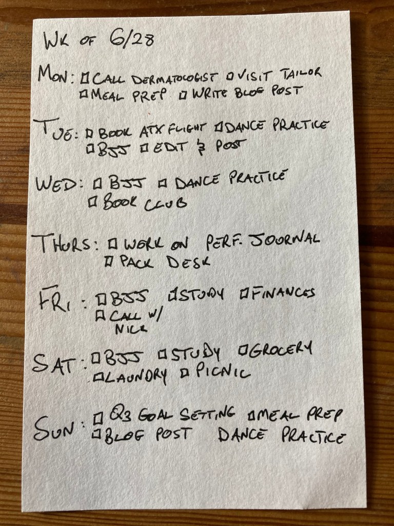 Step 1: Every Sunday night pull out a) your calendar b) your quarterly goals card and c) a blank index card.
