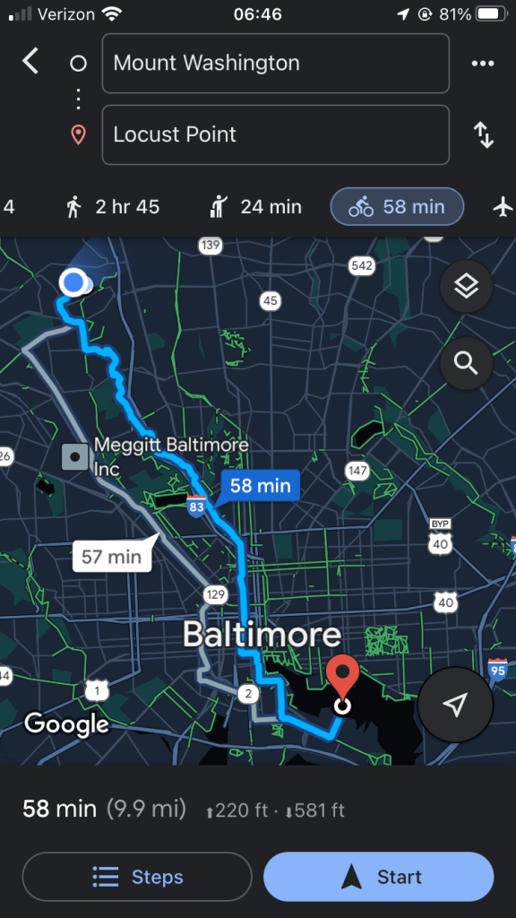 Baltimore isn’t exactly known for its safety, bike lanes, or well-paved roads. My commute does take me along the Jones Falls Trail to one of the few bike lanes going south, found on Maryland Ave. Having a shower at my office makes this much more doable as well. Access to a shower is a big unlock for the bike commuter.